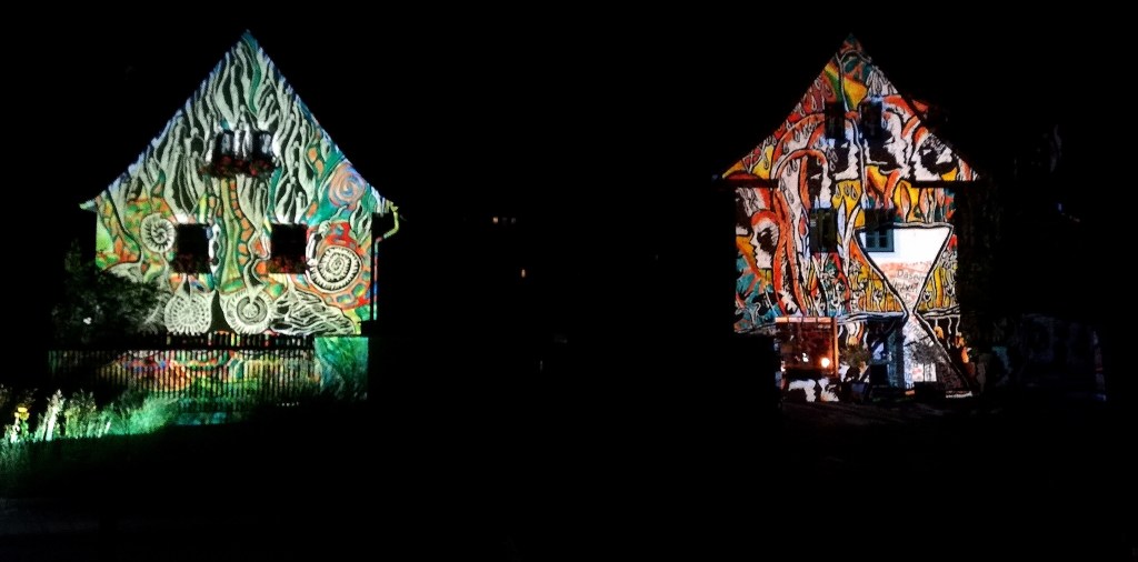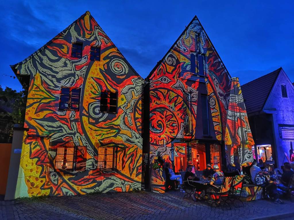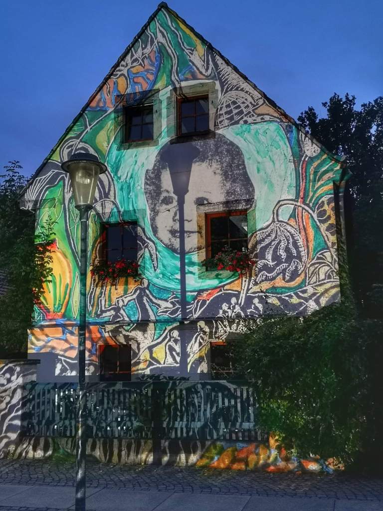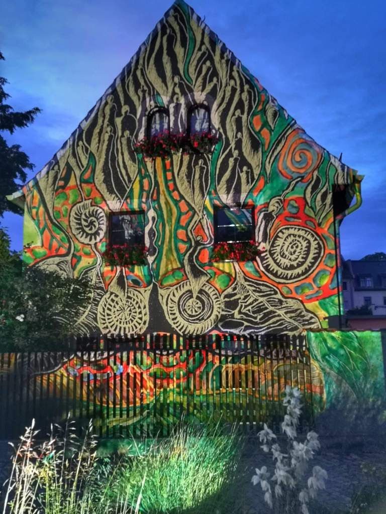 Etwas von diesem Zauber sollte auch im alten Dorfanger von Altkötzschenbroda zu erleben sein. Nach Einbruch der Dunkelheit erstrahlten einzelne Hausfassaden in anderem Licht, erzählten eigene Geschichten von seltenen farbigen Pflanzen, deren Blüten bevölkert waren mit zarten Figuren, kleinen Wesen und Fantasiegebilden. Sie breiteten sich über die hellen Fassaden aus, bereit, alles zu überwuchern und aus der strengen Form herauszuwachsen.