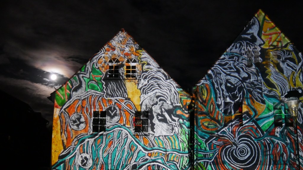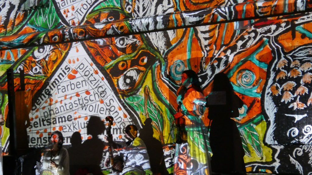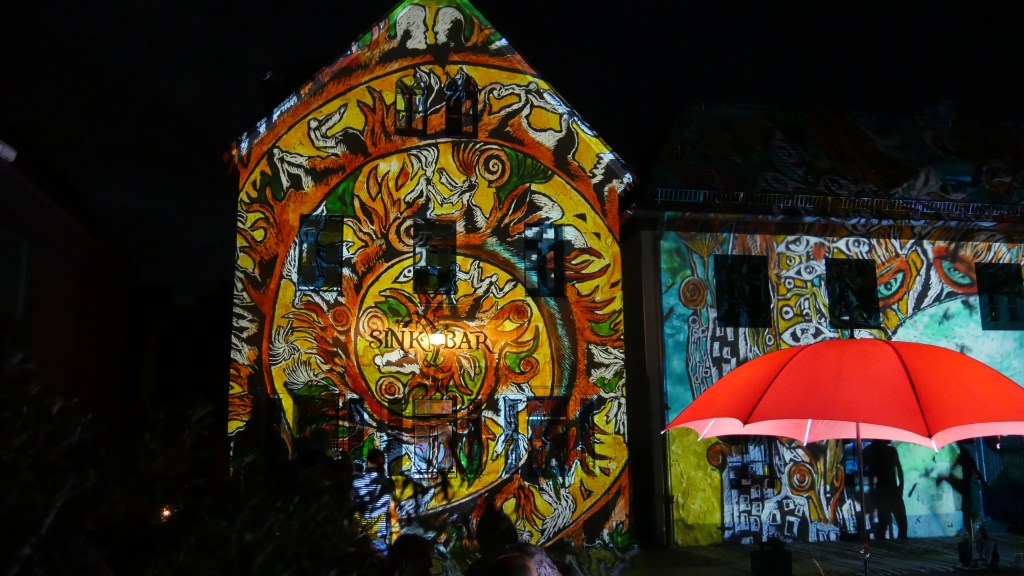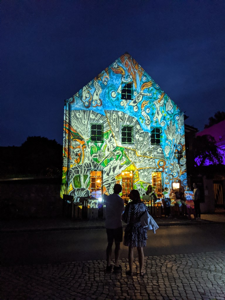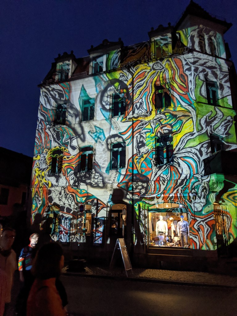 Etwas von diesem Zauber sollte auch im alten Dorfanger von Altkötzschenbroda zu erleben sein. Nach Einbruch der Dunkelheit erstrahlten einzelne Hausfassaden in anderem Licht, erzählten eigene Geschichten von seltenen farbigen Pflanzen, deren Blüten bevölkert waren mit zarten Figuren, kleinen Wesen und Fantasiegebilden. Sie breiteten sich über die hellen Fassaden aus, bereit, alles zu überwuchern und aus der strengen Form herauszuwachsen.